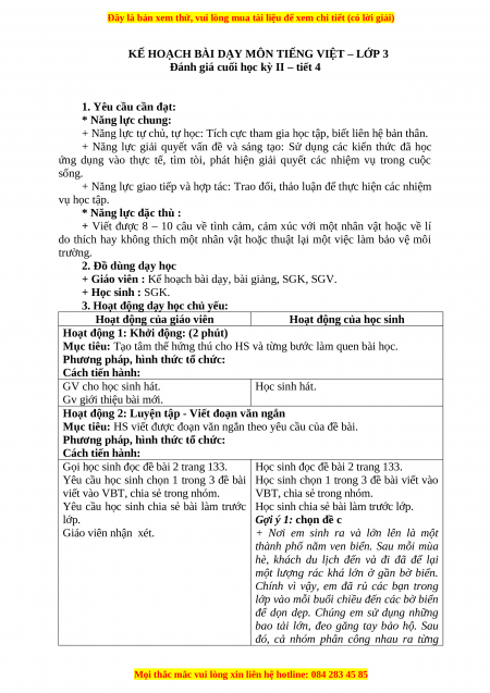 KẾ HOẠCH BÀI DẠY MÔN TIẾNG VIỆT – LỚP 3