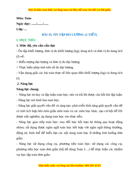 BÀI 35: ÔN TẬP ĐO LƯ N Ờ G (2 TI T Ế ) I. M C Ụ TIÊU 1. Mức đ , ộ yêu c u c ầ n đ ầ t ạ - Ôn t p ậ kh i ố lư ng, ợ đ n ơ v ịđo kh i ố lư ng ợ (kg); dung tích và đ n ơ v ịđo dung tích (l) v : ề + Bi u ể tư ng đ ợ i ạ lư ng ợ và đ n v ơ đo đ ị i ạ lư ng; ợ + Th c ự hi n phép t ệ ính trên s đo đ ố i ạ lư ng. ợ - V n ậ d ng ụ gi i ả các bài toán th c ự t ế liên quan đ n ế kh i ố lư ng ợ (kg) và dung tích (l). .2. Năng l c ự Năng l c chung ự : - Năng l c t ự duy và ư l p l ậ u n t ậ oán h c: ọ nêu và tr l ả i ờ đư c ợ câu h i ỏ khi l p ậ lu n ậ - Năng l c m ự ô hình hóa toán h c. ọ - Năng l c ự gi i ả quy t ế v n ấ đ và ề sáng t o: ạ phát tri n ể kh ả năng gi i ả quy t ế v n ấ đề có tính tích h p ợ liên môn gi a