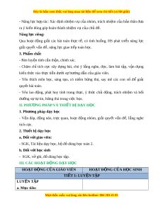 Đây là bản xem th , vu ử i lòng mua tài li u ệ đ xe ể m chi ti t (c ế ó l i ờ gi i ả ) - Năng l c ự h p ợ tác: Xác đ nh ị nhi m ệ v ụ c a ủ nhóm, trách nhi m ệ c a ủ b n ả thân đ a ư ra ý ki n đóng góp hoàn t ế hành nhi m ệ v c ụ a ủ ch đ ủ . ề Năng l c ri ự êng: Qua ho t ạ đ ng ộ gi i ả các bài toán th c ự t , ế có tình hu ng, ố HS phát tri n ể năng l c ự gi i ả quy t ế v n đ ấ , ề năng l c gi ự ao ti p t ế oán h c. ọ 3. Phẩm ch t ấ - Rèn luy n t ệ ính c n t ầ h n, chí ậ nh xác. - Chăm chỉ tích c c ự xây d ng ự bài, chú ý l ng ắ nghe, đ c, ọ làm bài t p, ậ v n ậ d ng ụ ki n t ế h c ứ vào th c t ự i n d ễ ư i ớ s h ự ư ng d ớ n c ẫ a ủ giáo viên. - Yêu thích môn h c, ọ sáng t o, ạ có ni m ề h ng