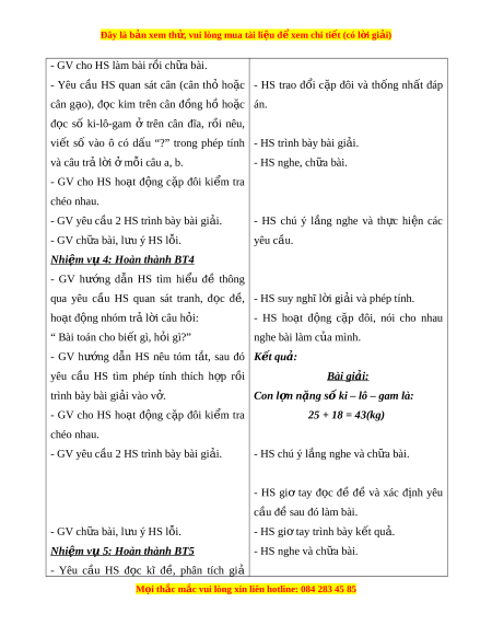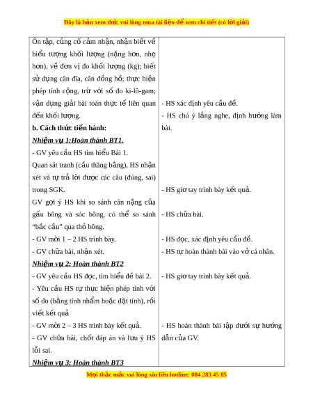 Đây là bản xem th , vu ử i lòng mua tài li u ệ đ xe ể m chi ti t (c ế ó l i ờ gi i ả ) Ôn t p, ậ c ng ủ cố c m ả nh n, ậ nh n ậ bi t ế về bi u ể tư ng ợ kh i ố lư ng ợ (n ng ặ h n, ơ nhẹ h n) ơ , về đ n ơ vị đo kh i ố lư ng ợ (kg); bi t ế sử d ng ụ cân đĩa, cân đ ng ồ h ; ồ th c ự hi n ệ phép tính c ng, ộ trừ v i ớ số đo ki-lô-gam; v n ậ d ng ụ gi i ả bài toán th c