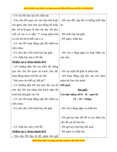 ụ : Hoàn thành BT4 - GV hư ng ớ d n ẫ HS tìm hi u ể đề thông qua yêu c u ầ HS quan sát tranh, đ c ọ đ , ề - HS suy nghĩ l i ờ gi i ả và phép tính. ho t ạ đ ng nhóm ộ tr l ả i ờ câu h i ỏ : - HS ho t ạ đ ng ộ c p ặ đôi, nói cho nhau “ Bài toán cho bi t ế gì, h i ỏ gì?” nghe bài làm c a ủ mình. - GV hư ng ớ d n ẫ HS nêu tóm t t
