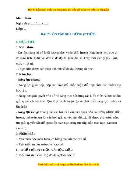 Ngày dạy: ....../......./...... L p: ớ ... BÀI 73: ÔN T P Ậ ĐO LƯ N Ờ G (2 TI T Ế ) I. M C Ụ TIÊU 1. Ki n t ế h c ứ - Ôn t p, c ậ ng ủ c v ố kh ề i ố lư ng, ợ đ n v ơ đo kh ị i ố lư ng ợ (kg); dung tích, đ n v ơ ị