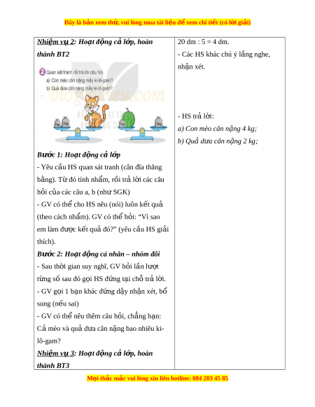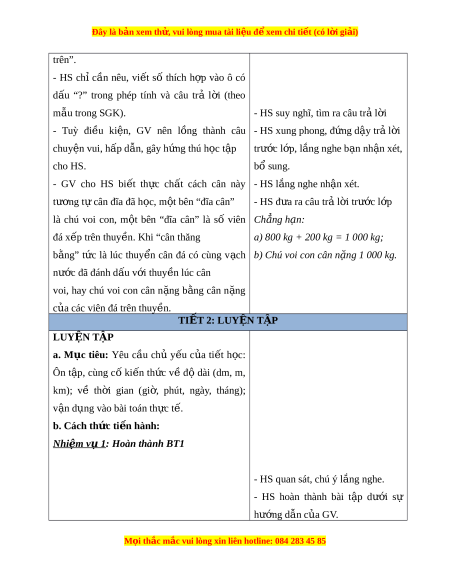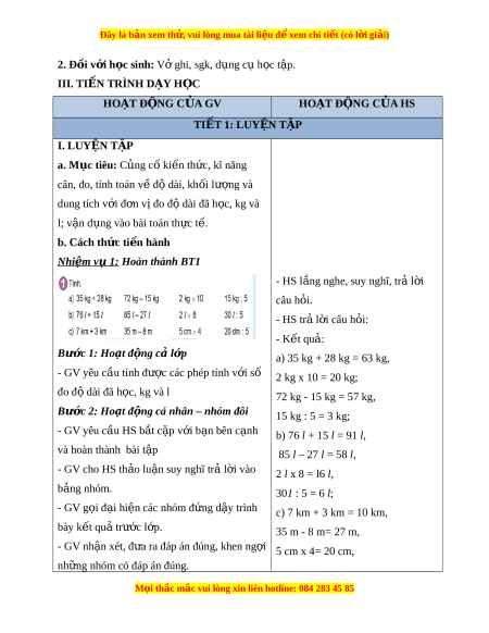 Đây là bản xem th , vu ử i lòng mua tài li u ệ đ xe ể m chi ti t (c ế ó l i ờ gi i ả ) 2. Đ i ố v i ớ h c s ọ inh: V ghi ở , sgk, d ng c ụ h ụ c t ọ p. ậ III. TI N Ế TRÌNH D Y Ạ H C Ọ HOẠT Đ N Ộ G C A Ủ GV HOẠT Đ N Ộ G C A Ủ HS TI T Ế 1: LUY N Ệ T P Ậ I. LUY N Ệ T P Ậ a. Mục tiêu: C ng ủ cố ki n t ế h c, kĩ ứ năng cân, đo, tính toán v đ ề dài ộ , kh i ố lư ng và ợ dung tích v i ớ đ n ơ v đo đ ị ộ dài đã h c, kg và ọ l; v n ậ d ng vào bài ụ toán th c t ự . ế b. Cách th c ứ ti n hàn ế h Nhi m ệ v 1: