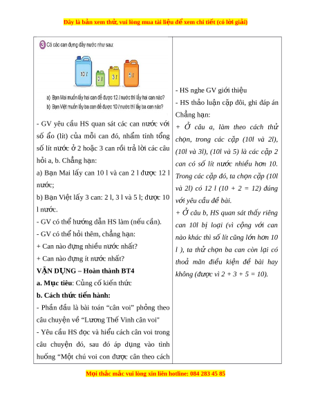 + Ở câu b, HS quan sát th y ấ riêng - GV có th h ể ư ng d ớ n H ẫ S làm (n u ế c n ầ ). can 10l bị lo i ạ (vì c ng ộ v i ớ can - GV có th h ể i ỏ thêm, ch ng ẳ h n: ạ