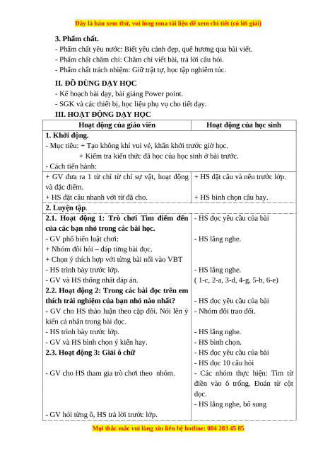 - Phẩm chất yêu nước: Biết yêu cảnh đẹp, quê hương qua bài tập đọc.