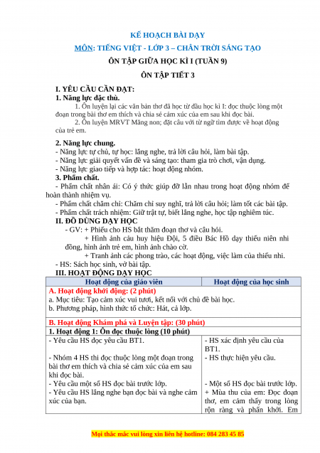 ÔN TẬP GIỮA HỌC KÌ I (TUẦN 9) ÔN TẬP TIẾT 3 I. YÊU CẦU CẦN ĐẠT: