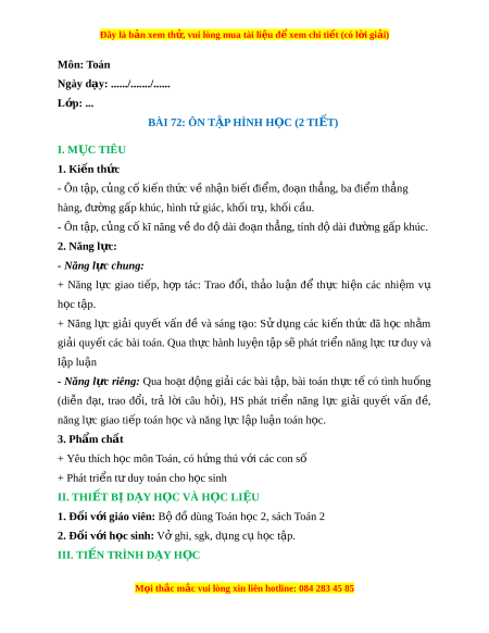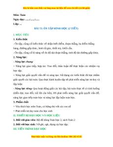 Ngày dạy: ....../......./...... L p: ớ ... BÀI 72: ÔN T P Ậ HÌNH H C Ọ (2 TI T Ế ) I. M C Ụ TIÊU 1. Ki n t ế h c ứ - Ôn t p, c ậ ng ủ c k ố i n ế th c v ứ nh ề n ậ bi t ế đi m ể , đo n t ạ h ng, ba ẳ đi m ể th ng ẳ hàng, đư ng ờ gấp khúc, hình t gi ứ ác, khối tr , kh ụ i ố c u. ầ - Ôn t p, c ậ ng ủ c k ố ĩ năng v đo đ ề dài ộ đo n ạ th ng, t ẳ ính đ dài ộ đư ng ờ g p khúc. ấ 2. Năng l c: ự - Năng l c ự chung: + Năng l c ự giao ti p, ế h p ợ tác: Trao đ i ổ , th o ả lu n ậ để th c ự hi n ệ các nhi m ệ vụ h c ọ t p. ậ + Năng l c ự gi i ả quy t ế v n ấ đ ề và sáng t o: ạ S ử d ng ụ các ki n ế th c ứ đã h c ọ nh m ằ gi i ả quy t