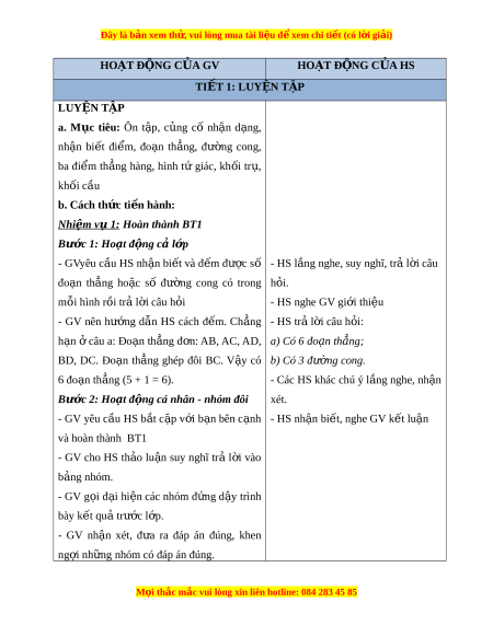 Đây là bản xem th , vu ử i lòng mua tài li u ệ đ xe ể m chi ti t (c ế ó l i ờ gi i ả ) HOẠT Đ N Ộ G C A Ủ GV HOẠT Đ N Ộ G C A Ủ HS TI T Ế 1: LUY N Ệ T P Ậ LUYỆN TẬP a. M c ụ tiêu: Ôn t p, ậ c ng ủ cố nh n ậ d ng, ạ nh n ậ bi t ế đi m ể , đo n ạ th ng, ẳ đư ng ờ cong, ba đi m ể th ng