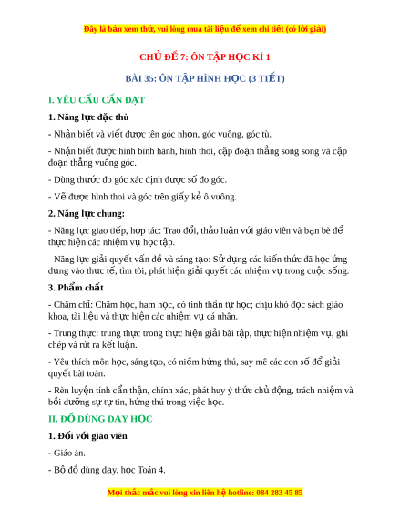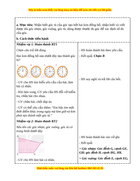 Đây là bản xem th , vu ử i lòng mua tài li u ệ đ xe ể m chi ti t (c ế ó l i ờ gi i ả ) a. Mục tiêu: Nh n bi ậ t ế góc tù c a ủ góc t o ạ b i ở hai kim đ ng h ồ ; ồ nh n bi ậ t ế và vi t ế đư c t