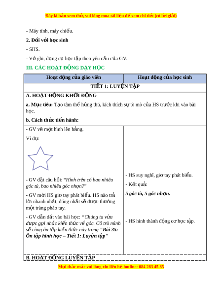 Đây là bản xem th , vu ử i lòng mua tài li u ệ đ xe ể m chi ti t (c ế ó l i ờ gi i ả ) - Máy tính, máy chi u. ế 2. Đ i ố v i ớ h c s ọ inh - SHS. - Vở ghi, d ng c ụ h ụ c ọ t p t ậ heo yêu c u c ầ a ủ GV. III. CÁC HO T Ạ Đ N Ộ G D Y Ạ H C Ọ Hoạt đ ng c ộ a gi ủ áo viên Hoạt đ ng c ộ a h ủ c s ọ inh TI T Ế 1: LUY N Ệ T P Ậ A. HOẠT Đ N Ộ G KH I Ở Đ N Ộ G a. Mục tiêu: T o t ạ âm th h ế ng t ứ