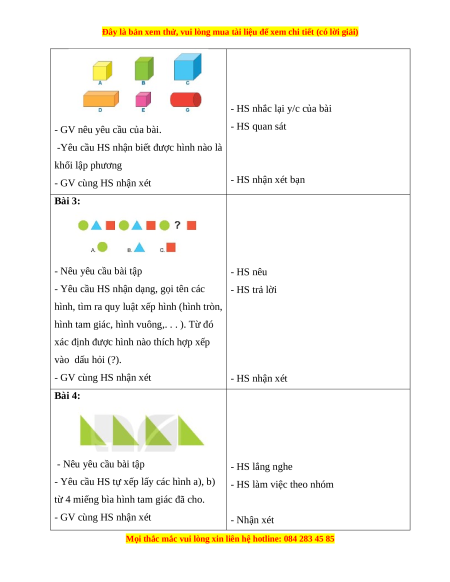 - Nhận biết dạng tổng thể, trực quan các hình phẳng, hình khối đã học qua mô hình