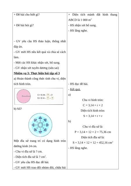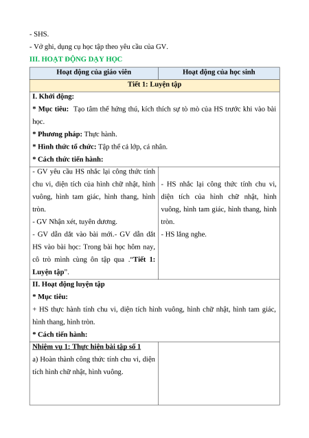 + HS thực hành tính chu vi, diện tích hình vuông, hình chữ nhật, hình tam giác, hình thang, hình tròn. * Cách tiến hành: Nhiệm vụ 1: