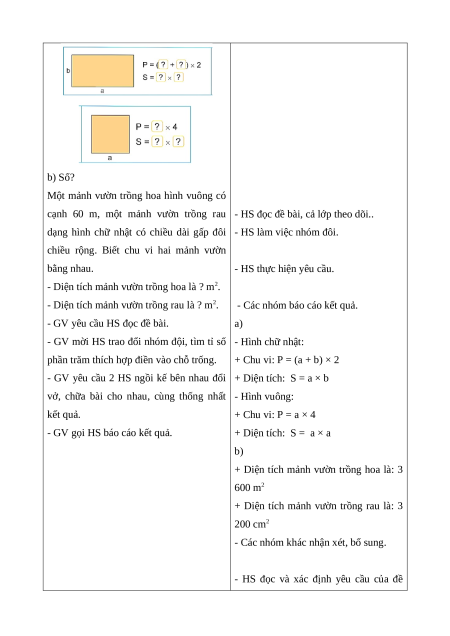 - GV gọi HS báo cáo kết quả. + Diện tích: S = a × a b)