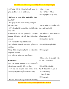 Đây là bản xem th , vu ử i lòng mua tài li u ệ đ xe ể m chi ti t (c ế ó l i ờ gi i ả ) - GV giúp HS hệ th ng ố hoá m i ố quan hệ 1 dm = 10 cm gi a ữ các đ n v ơ ị đo đ dài ộ đã h c. ọ 1 m = 10 dm = 100 cm - HS l ng ắ nghe GV h t ệ h ng ố Nhi m ệ vụ 4: Ho t ạ đ ng ộ nhóm b n, ố hoàn thành BT4 - GV giúp HS xác đ nh ị kho ng ả th i ờ gian 1 gi hay ờ 1 phút. - HS xác đ nh ị các kho ng ả th i ờ - GV yêu c u ầ HS nhóm b n ố tìm hi u