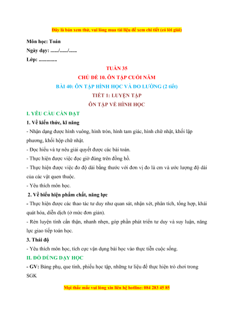BÀI 40: ÔN TẬP HÌNH HỌC VÀ ĐO LƯỜNG (2 tiết)