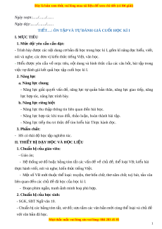 TIẾT…: ÔN TẬP VÀ T Đ Ự ÁNH GIÁ CU I Ố H C Ọ KÌ I I. M C Ụ TIÊU 1. Mức đ / ộ yêu c u c ầ n ầ đ t ạ : - Trình bày đư c ợ các n i ộ dung c b ơ n ả đã h c ọ trong h c ọ kì I, g m ồ kĩ năng đ c ọ hi u, ể vi t ế , nói và nghe; các đ n ơ v ki ị n ế th c ứ ti ng ế Vi t ệ , văn h c. ọ - Hi u ể được yêu c u ầ về m c ụ tiêu, n i ộ dung và hình th c ứ c a ủ các câu h i ỏ , bài t p ậ trong việc t đánh gi ự á k t ế quả h c t ọ p cu ậ ối h c ọ kì I. 2. Năng l c ự a. Năng l c ự chung - Năng l c ự gi i ả quy t ế v n â đ , ề năng l c ự t ự qu n ả b n ả thân, năng l c ự giao ti p, ế năng l c h ự p t ợ ác, năng l c t ự rình bày. b. Năng l c ri ự êng bi t ệ - Năng lực thu th p ậ thông tin liên quan đ n ế bài học.