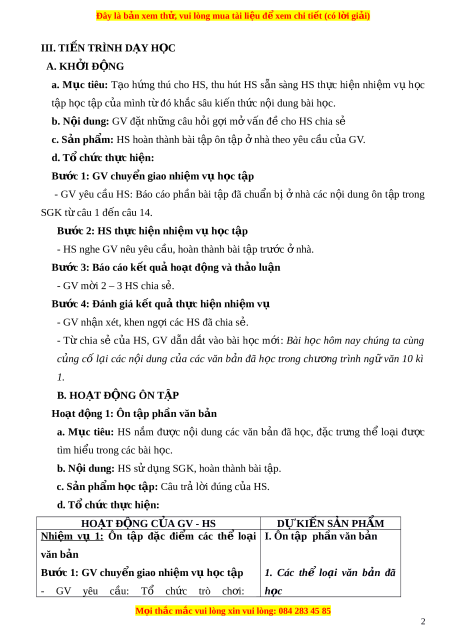 Đây là bản xem th , vu ử i lòng mua tài li u ệ đ xe ể m chi ti t ế (có l i ờ gi i ả ) nhi m ệ v h ụ c t ọ p ậ - GV nh n ậ xét, bổ sung, ch t ố l i ạ ki n t ế h c ứ Ghi lên b ng ả . HOẠT Đ N Ộ G C A Ủ GV - HS D K Ự IẾN SẢN PHẨM Nhi m ệ vụ 2: Ôn t p ậ các thể lo i