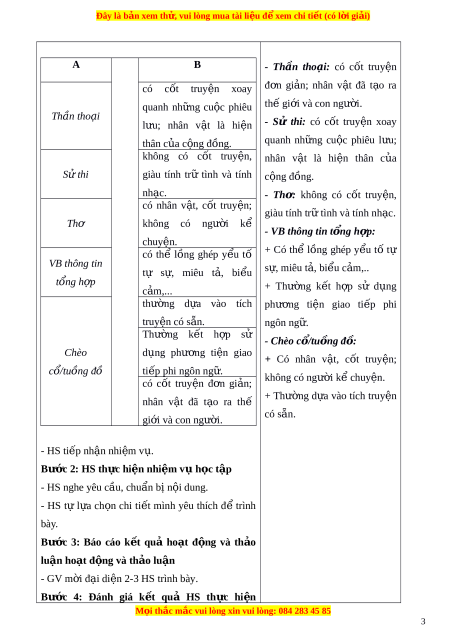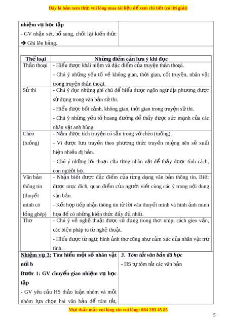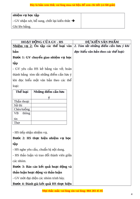 ả heo các th l ể o i ạ : Bư c ớ 1: GV chuy n ể giao nhi m ệ vụ h c ọ tập - GV yêu c u ầ HS kẻ b ng ả vào v , ở hoàn thành b ng ả tóm t t ắ nh ng ữ đi m ể c n ầ l u ư ý khi đ c ọ hi u ể m t ộ văn b n ả theo các thể lo i ạ : Thể loại Những đi m ể c n l ầ u ư ý Thần tho i ạ S t ử hi Chèo/tuồng VB thông tin Thơ - HS ti p nh ế n ậ nhi m ệ v . ụ Bư c ớ 2: HS th c ự hi n ệ nhi m ệ vụ h c ọ tập