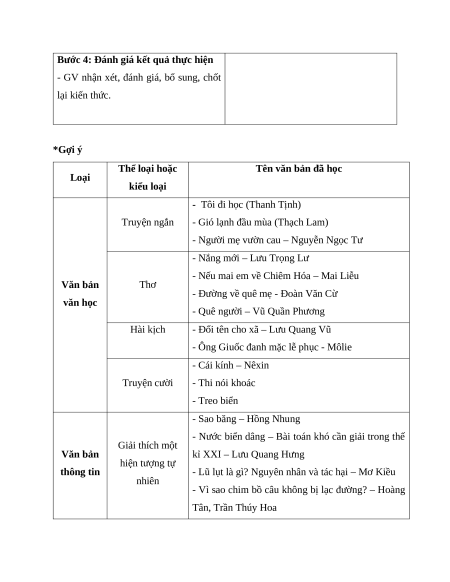 - GV nhận xét, đánh giá, bổ sung, chốt lại kiến thức. *Gợi ý Thể loại hoặc