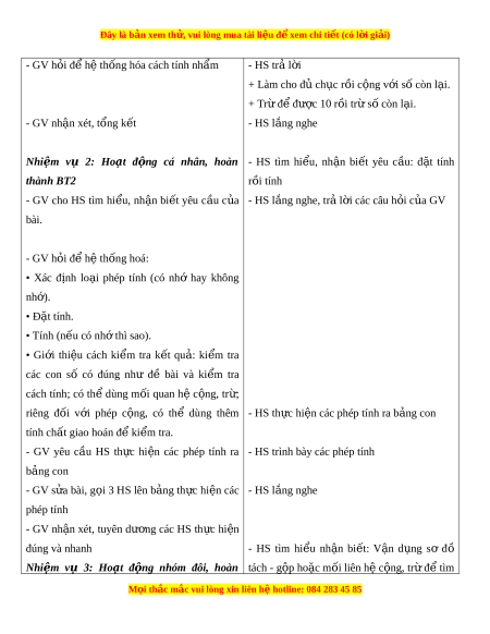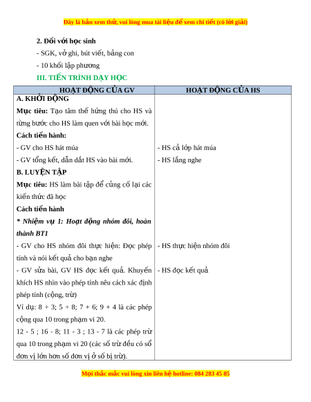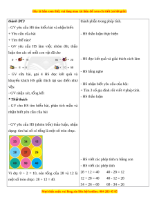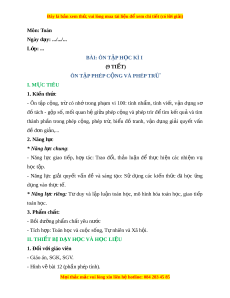 ự riêng: Tư duy và l p ậ lu n ậ toán h c, ọ mô hình hóa toán h c, ọ giao ti p ế toán h c. ọ 3. Phẩm ch t ấ : - Bồi dư ng ph ỡ m ẩ ch t ấ yêu nư c ớ - Tích h p: ợ Toán h c và cu ọ c ộ s ng, ố T nhi ự ên và Xã h i ộ . II. THIẾT B D Ị ẠY H C Ọ VÀ H C Ọ LI U Ệ 1. Đ i ố v i ớ giáo viên - Giáo án, SGK, SGV. - Hình v bài ẽ 12 (ph n phép t ầ ính). M i