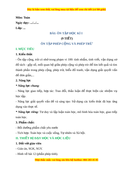 Ngày dạy: .../.../... L p: ớ ... BÀI: ÔN TẬP H C Ọ KÌ I (9 TIẾT) ÔN TẬP PHÉP C N Ộ G VÀ PHÉP TRỪ I. M C Ụ TIÊU 1. Ki n t ế h c ứ - Ôn t p ậ c ng, ộ trừ có nh ớ trong ph m ạ vi 100: tính nh m ẩ , tính vi t ế , v n ậ d ng ụ sơ đồ tách - g p ộ s , ố m i ố quan h ệ gi a ữ phép c ng ộ và phép trìr đ ể tìm k t ế qu ả và tìm thành ph n ầ trong phép c ng, ộ phép tr , ừ bi u ể đồ tranh, v n ậ d ng ụ gi i ả quy t ế v n ấ đ đ ề n ơ gi n,... ả 2. Năng l c ự