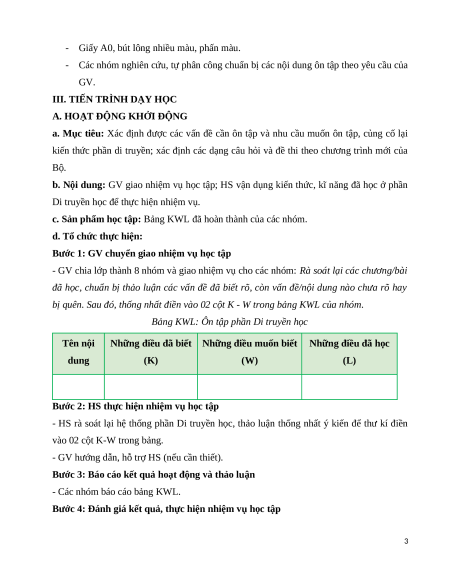 Bảng KWL: Ôn tập phần Di truyền học Tên nội
