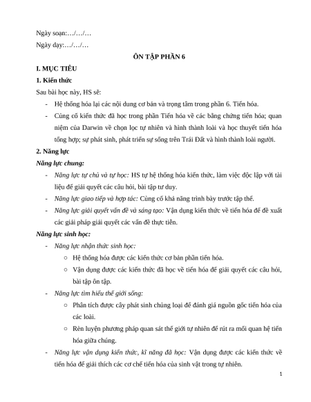 Ngày soạn:…/…/… Ngày dạy:…/…/… ÔN TẬP PHẦN 6 I. MỤC TIÊU 1. Kiến thức Sau bài học này, HS sẽ: