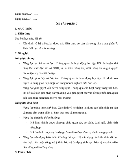 Ngày soạn:…/…/… Ngày dạy:…/…/… ÔN TẬP PHẦN 7 I. MỤC TIÊU 1. Kiến thức Sau bài học này, HS sẽ: