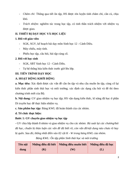 Bảng KWL: Ôn tập phần Sinh thái học và môi trường Tên nội