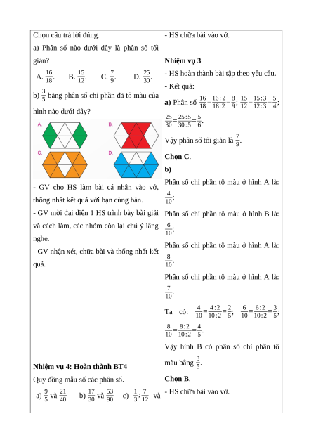 a) Phân số =16: 2= 8 ; =15:3= 5 ; 18 18:2 9 12 12 :3 4 hình nào dưới đây? 25 =25:5=5. 30 30 :5 6 7