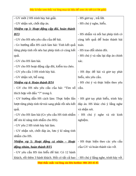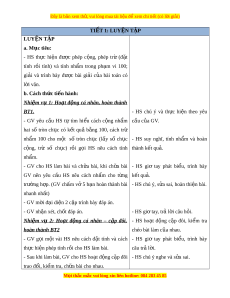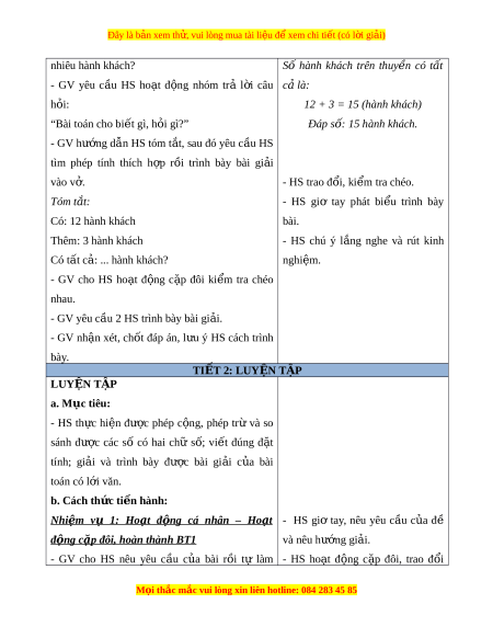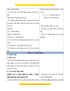 ọ thắc mắc vui lòng xin liên hotline: 084 283 45 85 Đây là bản xem th , vui ử lòng mua tài li u ệ đ xe ể m chi ti t ế (có l i ờ gi i ả ) TI T Ế 1: LUY N Ệ T P Ậ LUYỆN T P Ậ a. Mục tiêu: - HS th c ự hi n ệ đư c ợ phép c ng, ộ phép trừ (đ t ặ tính r i ồ tính) và tính nh m ẩ trong ph m ạ vi 100; gi i ả và trình bày đư c ợ bài gi i ả c a ủ bài toán có l i ờ văn. b. Cách th c t ứ i n hành: ế Nhi m ệ vụ 1: Ho t ạ đ ng