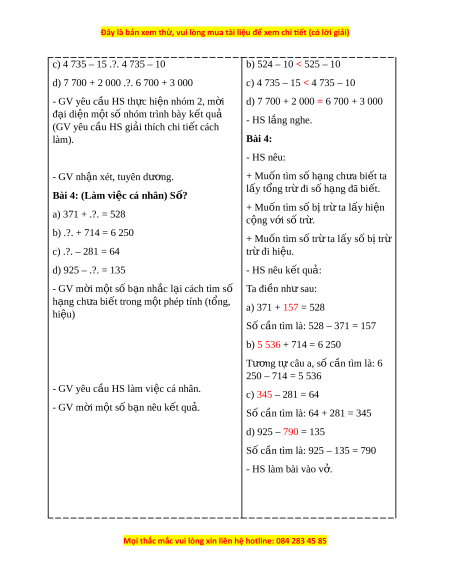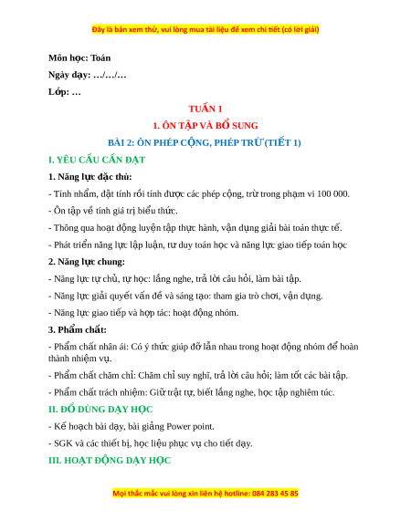I. YÊU CẦU CẦN ĐẠT 1. Năng l c đ ự c t ặ hù: - Tính nh m ẩ , đ t ặ tính r i ồ tính đư c các ợ phép c ng, t ộ r t ừ rong ph m ạ vi 100 000. - Ôn t p v ậ ề tính giá tr bi ị u t ể h c. ứ - Thông qua ho t ạ đ ng ộ luy n t ệ p ậ th c hành, v ự n ậ d ng gi ụ i ả bài toán th c ự t . ế - Phát tri n năng ể l c l ự p l ậ u n, ậ t duy t ư oán h c và năng ọ l c gi ự ao ti p t ế oán h c ọ 2. Năng l c chung ự : - Năng l c t ự ch ự , ủ t h ự c: ọ l ng ắ nghe, tr l ả i ờ câu h i ỏ , làm bài t p. ậ - Năng l c gi ự i ả quy t ế v n đ ấ và s ề áng t o: ạ tham gia trò ch i ơ , v n d ậ ng. ụ - Năng l c gi ự ao ti p và ế h p t ợ ác: ho t ạ đ ng ộ nhóm. 3. Phẩm ch t ấ : - Ph m ẩ ch t ấ nhân ái: Có ý th c gi ứ úp đ l ỡ n nhau t ẫ rong ho t ạ đ ng nhóm ộ đ hoàn ể thành nhi m ệ v . ụ - Ph m ẩ ch t ấ chăm ch : ỉ Chăm ch s ỉ uy nghĩ, tr l ả i ờ câu h i ỏ ; làm t t ố các bài t p. ậ - Ph m ẩ ch t ấ trách nhi m ệ : Gi t ữ r t ậ t , bi ự t ế l ng nghe, h ắ c ọ t p nghi ậ êm túc. II. Đ D Ồ ÙNG D Y Ạ H C Ọ - K ho ế ch ạ bài d y ạ , bài gi ng ả Power point. - SGK và các thi t ế b , h ị c ọ li u ph ệ c ụ v cho t ụ i t ế d y ạ . III. HOẠT Đ N Ộ G D Y Ạ H C Ọ