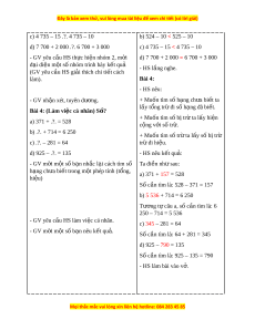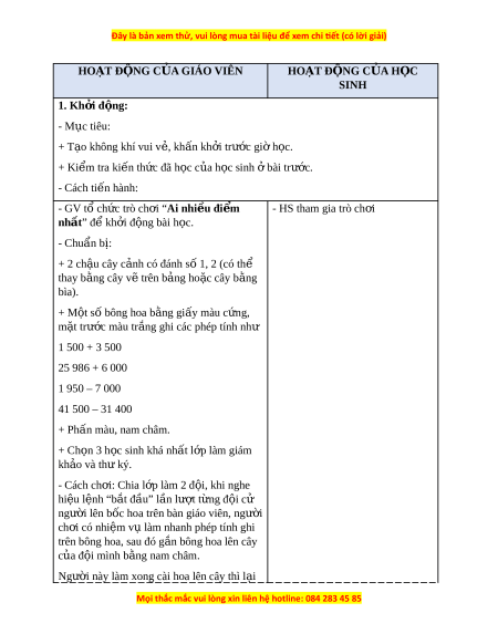 HOẠT Đ N Ộ G C A Ủ GIÁO VIÊN HOẠT Đ N Ộ G C A Ủ H C Ọ SINH 1. Kh i ở đ ng: ộ - M c t ụ iêu: + T o không khí ạ vui v , kh ẻ n kh ấ i ở trư c ớ gi h ờ c. ọ + Ki m ể tra ki n ế th c ứ đã h c c ọ a ủ h c s ọ inh bài ở trư c. ớ - Cách ti n hành: ế - GV tổ ch c t ứ rò ch i ơ “Ai nhi u đi ề m ể - HS tham gia trò ch i ơ nhất” đ kh ể i ở đ ng ộ bài h c. ọ - Chuẩn bị: + 2 ch u cây ậ c nh có ả đánh s 1, 2 ( ố có th ể thay b ng cây ằ v t ẽ rên b ng ả ho c cây ặ b ng ằ bìa). + M t ộ số bông hoa b ng gi ằ ấy màu c ng, ứ m t ặ trư c m ớ àu tr ng ghi ắ các phép tính như 1 500 + 3 500 25 986 + 6 000 1 950 – 7 000 41 500 – 31 400 + Ph n m ấ àu, nam châm. + Ch n 3 h ọ c ọ sinh khá nh t ấ l p l ớ àm giám kh o và t ả hư ký. - Cách ch i ơ : Chia l p l ớ àm 2 đ i ộ , khi nghe hiệu lệnh “b t ắ đ u” l ầ n l ầ ư t ợ t ng đ ừ i ộ c ử ngư i