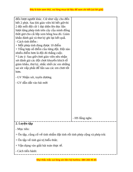 + Mỗi phép tính đúng đư c 10 đi ợ m ể + T ng h ổ p ợ s đi ố m ể c a t ủ ng đ ừ i ộ . Đ i ộ nào nhi u đi ề m ể h n l ơ à đ i ộ đó th ng ắ cu c. ộ * L u ý: ư Sau giờ ch i ơ giáo viên nêu nh n ậ xét đánh giá các đ i ộ ch i ơ khuy n khí ế ch t ổ giám kh o, t ả h ký, nh ư ắc nh các ở em nh ng ữ sai sót vấp ph i ả đ l ể ần sau các em ch i ơ tốt h n. ơ - GV Nh n ậ xét, tuyên dư ng. ơ - GV dẫn d t ắ vào bài m i ớ - HS l ng ắ nghe. 2. Luy n t ệ ập - Mục tiêu: + Ôn t p, c ậ ng ủ c v ố ề tính nh m ẩ đ t ặ tính r i ồ tính phép c ng ộ và phép tr . ừ + Ôn t p v ậ t ề ính giá tr b ị i u ể th c. ứ + V n ậ d ng vào gi ụ i ả bài toán th c t ự . ế - Cách ti n hành: ế