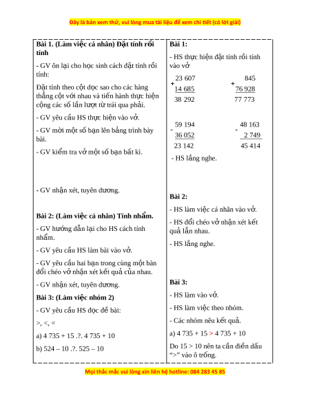 Bài 1. (Làm vi c cá nhân ệ ) Đ t ặ tính r i ồ Bài 1: tính - HS th c ự hi n đ ệ t ặ tính r i ồ tính - GV ôn l i ạ cho h c ọ sinh cách đ t ặ tính r i ồ vào vở tính: 23 607 845 Đ t ặ tính theo c t ộ d c s ọ ao cho các hàng 14 685 76 928 th ng c ẳ t ộ v i ớ nhau và ti n hành t ế h c hi ự n ệ 38 292 77 773 c ng các ộ số lần lư t ợ t t ừ rái qua ph i ả . - GV yêu cầu HS th c hi ự n vào v ệ . ở 59 194 48 163 - GV m i ờ m t ộ số b n ạ lên b ng t ả rình bày 36 052 2 749 bài. 23 142 45 414 - GV ki m ể tra v m ở t ộ số b n ạ b t ấ kì. - HS l ng ắ nghe. - GV nh n xét ậ , tuyên dư ng. ơ Bài 2: - HS làm vi c cá ệ nhân vào v . ở Bài 2: (Làm vi c cá ệ nhân) Tính nh m ẩ . - HS đổi chéo v nh ở n ậ xét k t ế - GV hư ng d ớ ẫn l i ạ cho HS cách tính qu l ả ẫn nhau. nh m ẩ . - HS l ng ắ nghe.