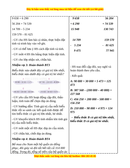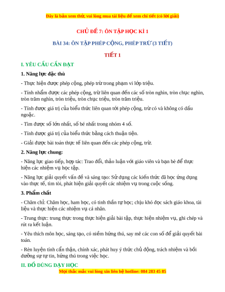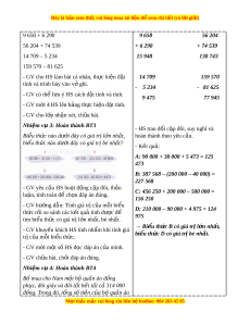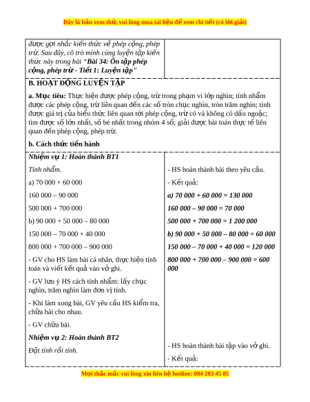 rong bài “Bài 34: Ôn t p phép ậ c ng, phép t ộ r - ừ Ti t ế 1: Luy n t ệ p ậ ” B. HO T Ạ Đ N Ộ G LUY N Ệ T P Ậ a. Mục tiêu: Th c ự hi n đ ệ ư c ợ phép c ng, ộ tr t ừ rong ph m ạ vi l p nghì ớ n; tính nh m ẩ đư c các ợ phép c ng, t ộ r l ừ iên quan đ n các ế số tròn ch c nghì ụ n, tròn trăm nghìn; tính đư c gi ợ á tr c ị a bi ủ u t ể h c ứ liên quan t i ớ phép c ng, t ộ r có và không có ừ d u ngo ấ c; ặ tìm đư c s ợ ố l n nh ớ t ấ , s bé nh ố t ấ trong nhóm 4 s ; ố gi i ả đư c ợ bài toán th c t ự l ế iên quan đ n phép c ế ng, ộ phép tr . ừ b. Cách th c t ứ i n hành ế Nhi m ệ v 1