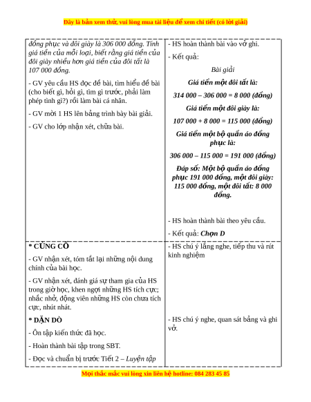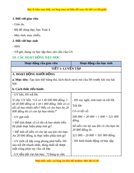 Đây là bản xem th , vu ử i lòng mua tài li u ệ đ xe ể m chi ti t (c ế ó l i ờ gi i ả ) 1. Đ i ố v i ớ giáo viên - Giáo án. - Bộ đồ dùng d y ạ , h c ọ Toán 4. - Máy tính, máy chi u. ế 2. Đ i ố v i ớ h c s ọ inh - SHS. - Vở ghi, d ng c ụ h ụ c ọ t p t ậ heo yêu c u c ầ a ủ GV. III. CÁC HO T Ạ Đ N Ộ G D Y Ạ H C Ọ Hoạt đ ng c ộ a gi ủ áo viên Hoạt đ ng c ộ a h ủ c s ọ inh TI T Ế 1: LUY N Ệ T P Ậ A. HOẠT Đ N Ộ G KH I Ở Đ N Ộ G a. Mục tiêu: T o t ạ âm th h ế ng t ứ