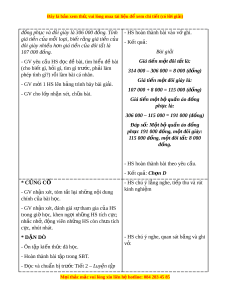 tròn trăm nghìn, tròn tri u, t ệ ròn ch c t ụ ri u, t ệ ròn trăm tri u. ệ - Tính đư c ợ giá tr c ị a ủ bi u t ể h c l ứ iên quan t i ớ phép c ng, ộ tr có ừ và không có d u ấ ngo c. ặ - Tìm đư c ợ s l ố n nh ớ t ấ , s bé nh ố t ấ trong nhóm 4 s . ố - Tính dư c ợ giá tr c ị a ủ bi u t ể h c b ứ ng cách ằ thu n t ậ i n. ệ - Gi i ả đư c ợ bài toán th c t ự l ế iên quan đ n ế các phép c ng, ộ tr . ừ 2. Năng l c chung ự : - Năng l c gi ự ao ti p, h ế p ợ tác: Trao đ i ổ , th o ả lu n v ậ i ớ giáo viên và b n bè đ ạ t ể h c ự hiện các nhi m ệ v h ụ c ọ t p. ậ - Năng l c gi ự i ả quy t ế v n đ ấ và s ề áng t o: ạ S d ử ng các ụ ki n ế th c đã h ứ c ọ ng ứ d ng ụ vào th c ự t , t ế ìm tòi, phát hi n gi ệ i ả quy t ế các nhi m ệ v t ụ rong cu c s ộ ng. ố 3. Phẩm ch t ấ - Chăm ch : ỉ Chăm h c, ham ọ h c, ọ có tinh th n t ầ h ự c; ọ ch u khó đ ị c s ọ ách giáo khoa, tài li u và t ệ h c hi ự n các ệ nhi m ệ v cá ụ nhân. - Trung th c: ự trung th c t ự rong th c hi ự n gi ệ i ả bài t p, ậ th c hi ự n nhi ệ m ệ v , ụ ghi chép và rút ra k t ế lu n. ậ - Yêu thích môn h c, s ọ áng t o, có ạ ni m ề h ng t ứ hú, say mê các con s đ ố gi ể i ả quy t ế bài toán. - Rèn luy n t ệ ính c n t ẩ h n, chí ậ nh xác, phát huy ý th c ch ứ đ ủ ng, ộ trách nhi m ệ và b i ồ dư ng ỡ s t ự t ự in, h ng t ứ hú trong vi c h ệ c. ọ II. Đ D Ồ ÙNG D Y Ạ H C Ọ M i