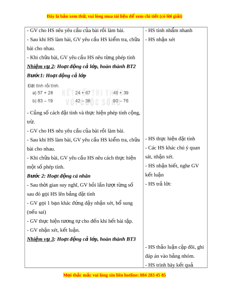 Bước 2: Hoạt đ ng cá ộ nhân k t ế lu n ậ - Sau th i ờ gian suy nghĩ, GV h i ỏ l n l ầ ư t ợ t ng s ừ ố - HS trả l i ờ : sau đó g i ọ HS lên b ng ả đ t ặ tính - GV g i ọ 1 b n khác ạ đ ng d ứ y nh ậ n ậ xét, b s ổ ung (n u s ế ai) - GV th c ự hi n t ệ ư ng t ơ cho đ ự n khi ế h t ế bài t p. ậ - GV nh n xét ậ , k t ế lu n. ậ Nhi m ệ v 3 ụ : Ho t ạ đ ng ộ c l ả p, hoàn t ớ hành BT3 - HS th o l ả u n ậ c p đôi ặ , ghi đáp án vào b ng nhóm ả . - HS trình bày k t ế quả M i
