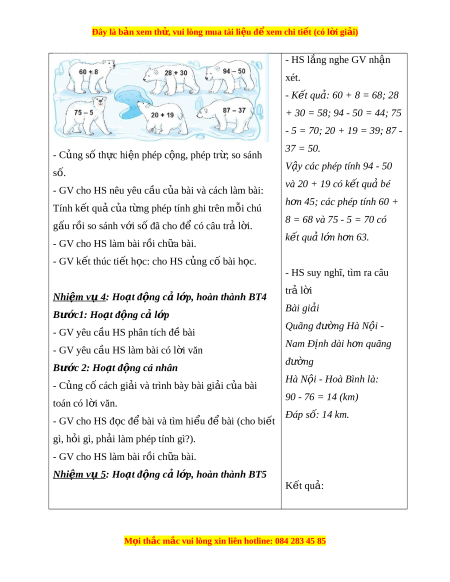 Bước 2: Hoạt đ ng cá ộ nhân Hà N i ộ - Hoà Bình là: - C ng c ủ ố cách gi i ả và trình bày bài gi i ả c a ủ bài 90 - 76 = 14 (km) toán có l i ờ văn. Đáp số: 14 km. - GV cho HS đ c đ ọ bài ể và tìm hi u đ ể bài ể (cho bi t ế gì, h i ỏ gì, ph i ả làm phép tính gì?). - GV cho HS làm bài r i ồ ch a bài ữ . Nhi m ệ v 5 ụ : Ho t ạ đ ng ộ c l ả p, hoàn t ớ hành BT5 K t ế qu : ả M i