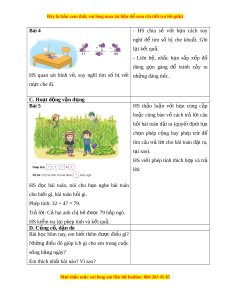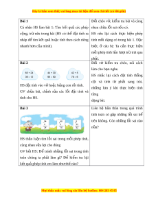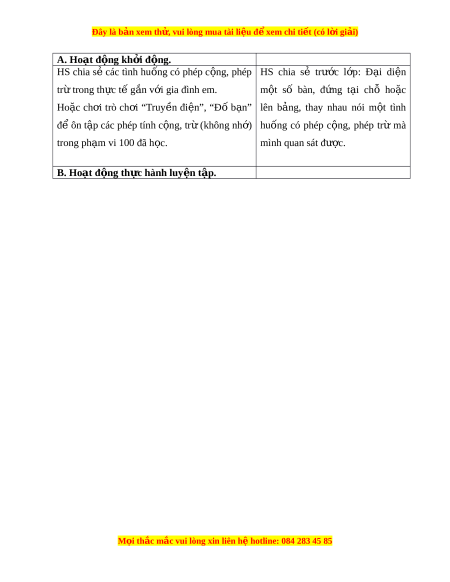 Đây là bản xem th , vu ử i lòng mua tài li u ệ đ xe ể m chi ti t (c ế ó l i ờ gi i ả ) A. Hoạt đ ng k ộ h i ở đ ng. ộ HS chia sẻ các tình hu ng ố có phép c ng, ộ phép HS chia sẻ trư c ớ l p: ớ Đ i ạ di n ệ tr t ừ rong th c ự t g ế n v ắ i ớ gia đình em. m t ộ số bàn, đ ng ứ t i ạ chỗ ho c ặ Hoặc ch i ơ trò ch i ơ “Truy n ề đi n”, ệ “Đố b n” ạ lên b ng, ả thay nhau nói m t ộ tình để ôn t p ậ các phép tính c ng, ộ tr ( ừ không nh ) ớ huống có phép c ng, ộ phép trừ mà trong ph m ạ vi 100 đã h c. ọ mình quan sát đư c. ợ B. Hoạt đ ng t ộ h c hành l ự uy n t ệ p. ậ M i