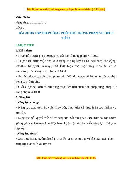 Ngày dạy: ....../......./...... L p: ớ ... BÀI 70: ÔN T P Ậ PHÉP C N Ộ G, PHÉP TR Ừ TRONG PH M Ạ VI 1 000 (3 TIẾT) I. M C Ụ TIÊU 1. Ki n t ế h c ứ + Th c ự hi n đ ệ ư c ợ phép c ng, phép ộ tr các ừ s t ố rong ph m ạ vi 1000. + Th c ự hi n ệ đư c ợ vi c ệ tính to n ắ trong trư ng ờ h p ợ có hai d u ấ phép tính c ng, ộ