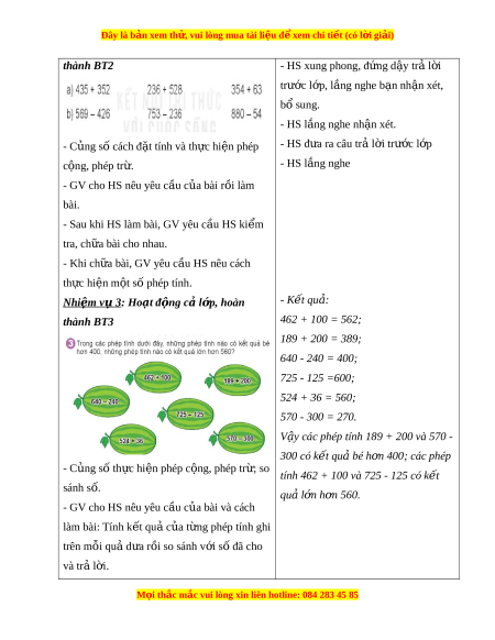 - Sau khi HS làm bài, GV yêu c u H ầ S ki m ể tra, ch a bài ữ cho nhau. - Khi ch a bài ữ , GV yêu c u H ầ S nêu cách th c ự hi n m ệ t ộ số phép tính. Nhi m ệ v 3 ụ : Ho t ạ đ ng ộ c l ả p, hoàn ớ - K t ế qu : ả thành BT3 462 + 100 = 562; 189 + 200 = 389; 640 - 240 = 400; 725 - 125 =600; 524 + 36 = 560; 570 - 300 = 270. V y các phép t ậ