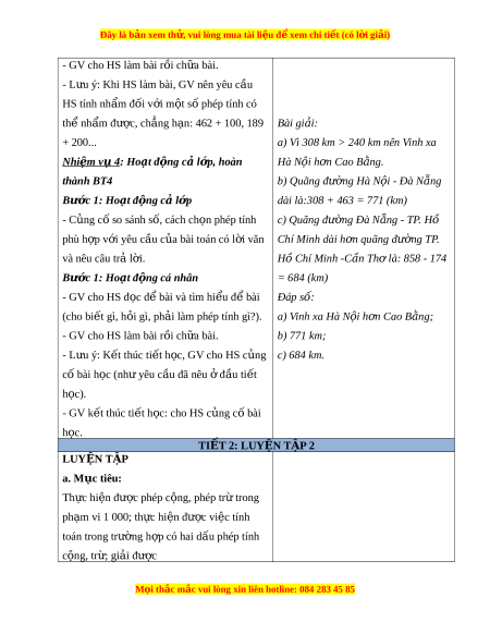 ớ giáo viên: Bộ đồ dùng Toán h c 2 ọ 2. Đ i ố v i ớ h c s ọ inh: V ghi ở , sgk, d ng c ụ h ụ c t ọ p. ậ III. TI N Ế TRÌNH D Y Ạ H C Ọ HOẠT Đ N Ộ G C A Ủ GV HOẠT Đ N Ộ G C A Ủ HS TI T Ế 1: LUY N Ệ T P Ậ LUYỆN TẬP a. Mục tiêu: Th c hi ự n đ ệ ư c phép ợ c ng, ộ phép tr t ừ rong ph m ạ vi 1000; th c hi ự n ệ đư c ợ c ng, t ộ r nh ừ ẩm; so sánh đư c các ợ s ố trong ph m ạ vi 1000; gi i ả đư c ợ bài toán có n i ộ dung th c ự ti n l ễ iên quan đ n phép c ế ng, ộ phép tr t ừ rong ph m ạ vi 1000 b. Cách th c ứ ti n hàn ế h Nhi m ệ v 1: