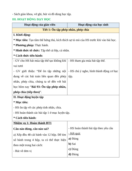 BÀI 93: ÔN TẬP PHÉP NHÂN, PHÉP CHIA (TIẾP THEO) (3 TIẾT)