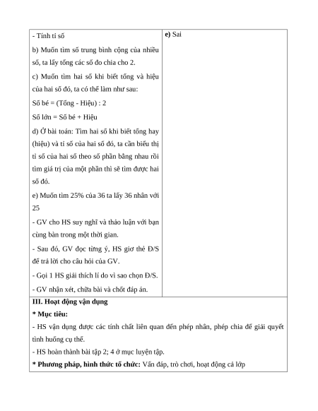 số bánh trong 4 hộp, ta có thể thực hiện a) Đúng theo một trong hai cách: b) Sai c) Đúng - Rút về đơn vị d) Đúng - Tính tỉ số e) Sai