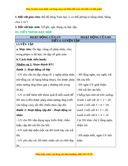 ớ giáo viên: Bộ đồ dùng Toán h c 2, có ọ th phóng t ể o b ng nhân, b ả ng ả chia 2 và 5 2. Đ i ố v i ớ h c s ọ inh: V ghi ở , sgk, d ng c ụ h ụ c t ọ p. ậ III. TI N Ế TRÌNH D Y Ạ H C Ọ HOẠT Đ N Ộ G C A Ủ GV HOẠT Đ N Ộ G C A Ủ HS TI T Ế 1: LUY N Ệ T P Ậ LUYỆN TẬP