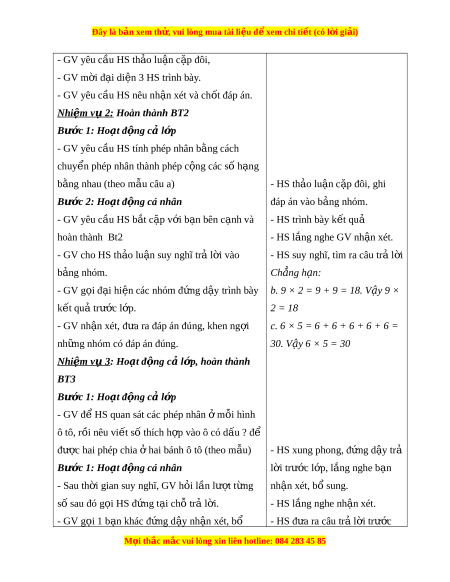 Bước 1: Hoạt đ ng c ộ l ả p ớ - GV yêu cầu ôn t p c ậ ng c ủ y nghĩ ố a phép nhân - HS l ng ắ nghe, suy nghĩ, tr ả (t t ừ ổng các số h ng ạ b ng nhau) ằ , tìm đư c phép ợ l i ờ câu h i ỏ . nhân tư ng ơ ng ( ứ theo g i ợ y đư ng n ờ i ố trong - HS nghe GV gi i ớ thi u ệ SGK) - HS tr l ả i ờ câu h i ỏ : - GV có th t ể hêm b t ớ nhóm qu ả ở m i ỗ tranh đ ể Ch ng ẳ h n t ạ ính t t ừ rên xu ng ố : HS nêu (vi t ế ) đư c phép nhân t ợ ư ng ơ ng ( ứ vi t ế Tranh 1 nối v i ớ 10 × 2 = 20; vào b ng ả con), rồi đ i ố chi u ế theo c p đôi ặ tranh 2 nối v i ớ 3 × 6 = 18;