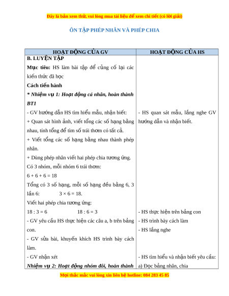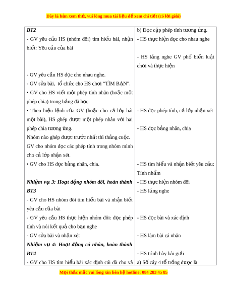 Đây là bản xem th , vu ử i lòng mua tài li u ệ đ xe ể m chi ti t (c ế ó l i ờ gi i ả ) BT2 b) Đ c ọ c p ặ phép tính tư ng ơ ng. ứ - GV yêu c u ầ HS (nhóm đôi) tìm hi u ể bài, nh n ậ - HS th c hi ự n đ ệ c cho nhau ọ nghe bi t ế : Yêu c u c ầ a ủ bài - HS l ng ắ nghe GV phổ bi n ế lu t ậ ch i ơ và th c hi ự ện - GV yêu cầu HS đ c ọ cho nhau nghe. - GV s a bài ử , tổ ch c ứ cho HS ch i ơ “TÌM B N Ạ ”. • GV cho HS vi t ế m t ộ phép tính nhân (ho c ặ m t ộ phép chia) trong b ng đã h ả c. ọ • Theo hi u ệ l nh ệ c a ủ GV (ho c ặ cho cả l p ớ hát - HS đ c phép t ọ ính, c l ả p nh ớ n ậ xét m t ộ bài), HS ghép đư c ợ m t ộ phép nhân v i ớ hai phép chia tư ng ơ ng. ứ - HS đ c b ọ ng ả nhân, chia Nhóm nào ghép đư c t ợ rư c nh ớ t ấ thì th ng cu ắ c. ộ GV cho nhóm đ c