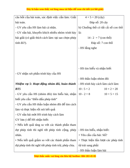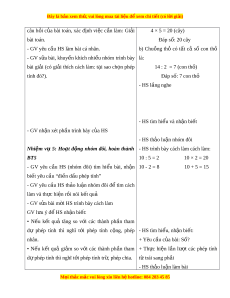 ả thích cách làm: t i ạ sao ch n ọ phép 14 : 2 = 7 (con th ) ỏ tính đó?). Đáp số: 7 con thỏ - HS l ng nghe ắ - HS tìm hi u ể và nh n bi ậ t ế - GV nh n xét ậ ph n t ầ rình bày c a ủ HS - HS th o l ả u n ậ nhóm đôi Nhi m ệ vụ 5: Ho t ạ đ ng